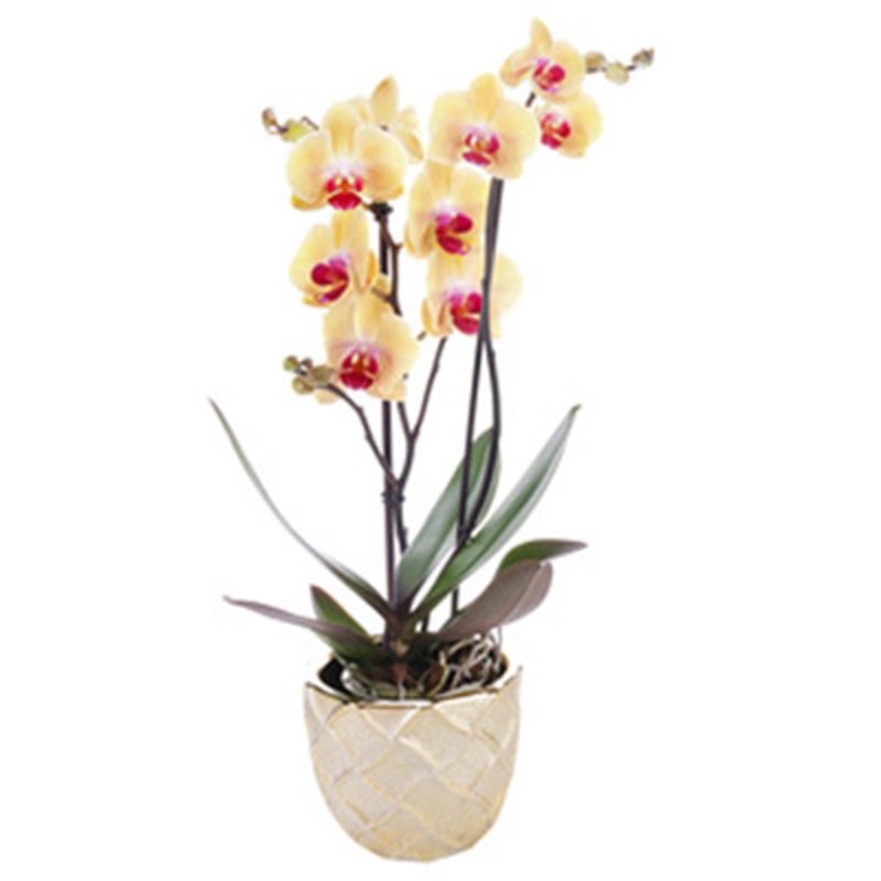 עציץ סחלב זוגות צהוב בכלי חרס, משלוח מושלם לאנשים שאוהבים סחלבים, ניתן לבחור ממגוון הצבעים הקיימים במלאי החנות.
